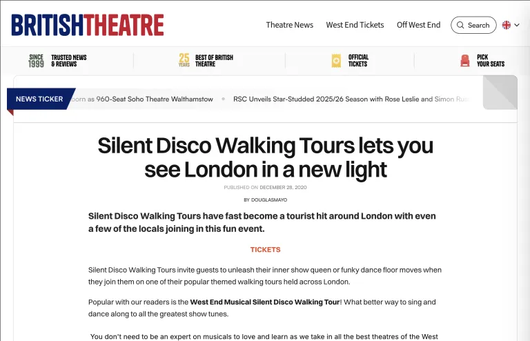 British Theatre Features Silent Disco Walking Tours Coming out of the pandemic, we were thrilled to be featured by British Theatre, who spotlighted our West End Musical Silent Disco Tour as one of Read More »