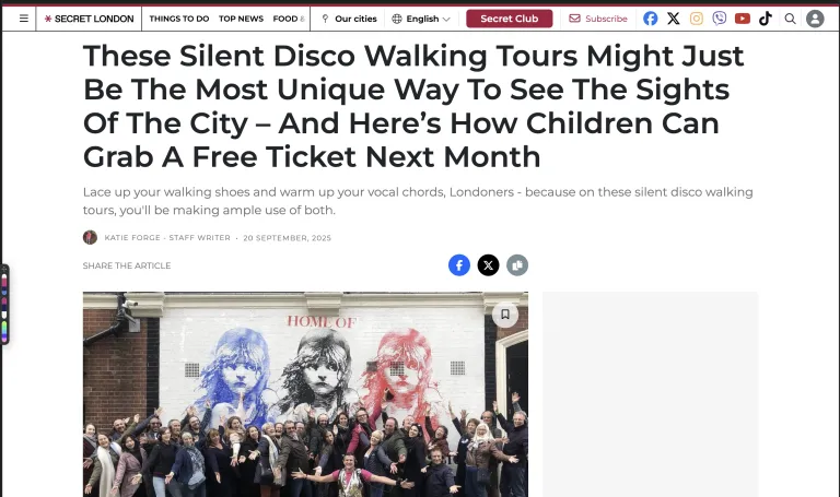 Secret London Names Silent Disco Walking Tours “The Most Unique Way to See the City” We’re thrilled to be featured by Secret London as “perhaps the most unique way to see the sights of the city”! Read all about their Silent Read More »